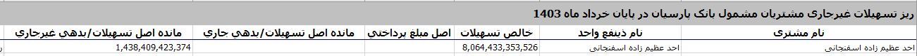 فهرست ابر بدهکاران بانک پارسیان نشان می‌دهد این بانک خصوصی به احد عظیم‌زاده اسفنجانی مبلغ ۸۰۶ میلیارد و ۴۴۳ میلیون تومان تسهیلات پرداخت کرده است.