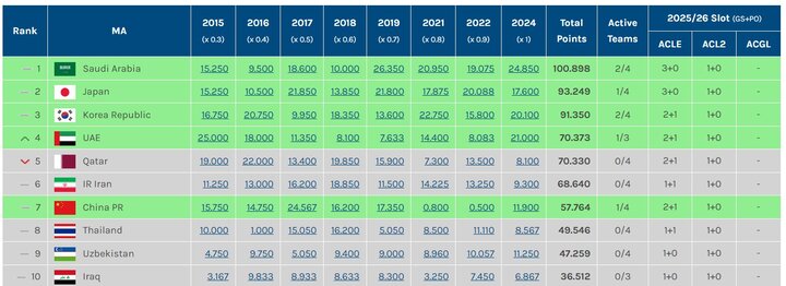 رقابت‌های لیگ قهرمانان آسیا در فصل ۲۶- ۲۰۲۵ با شیوه جدید برگزار خواهد شد و لیگ نخبگان آسیا و لیگ قهرمانان آسیا ۲ (تیم‌های سطح ۲ آسیا) دو رقابت باشگاه‌های فوتبال در قاره آسیا خواهند بود. هنوز سهمیه بندی رسمی کشورها برای مسابقات فصل آینده از طرف کنفدراسیون فوتبال آسیا AFC به طور رسمی اعلام نشده است. کشورهای ایران و امارات برای تعداد سهمیه در این دو رویداد رقابت تنگاتنگی با هم داشتند که به خاطر صعود العین به نیمه نهایی و نبود نماینده‌ای از ایران در مرحله نیمه نهایی لیگ قهرمانان آسیا امتیازهای امارات از ایران پیشی گرفت و به ۳۳۳/‌‬ ۷۰ رسید و امتیاز ایران در عدد ۶۴۰/‏‬ ۶۸ باقی ماند.