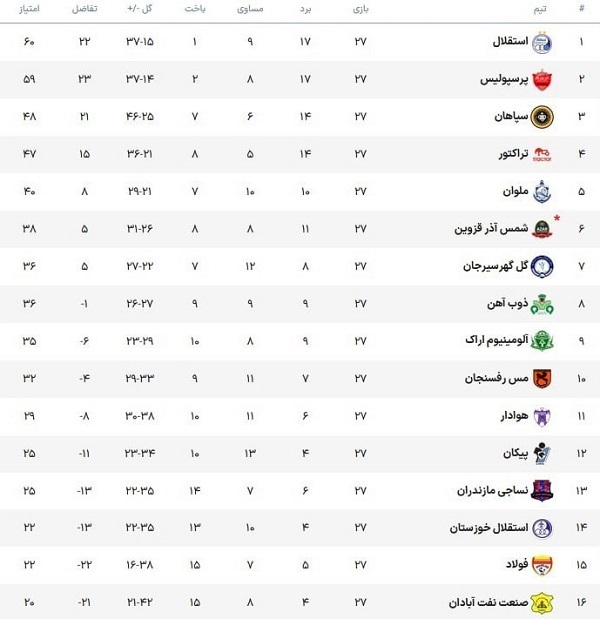 آذرتیتر: سه دیدار باقی مانده هفته بیست و هفتم لیگ برتر امروز ۲۴ ارديبهشت ماه با پیروزی ذوبآهن، نساجی و استقلال پایان یافت تا در پایان این هفته استقلال بار دیگر جایگاه خود در صدر جدول را پس بگیرد و همچنان پرسپولیس در تعقیب آبیها باشد.
